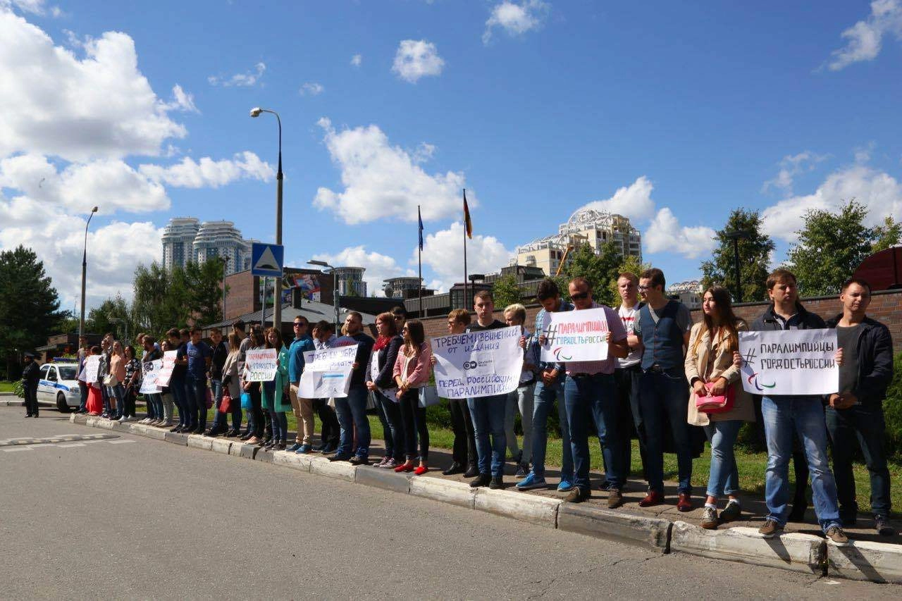 Пикетирующие выстроились у посольства Германии с плакатами: «Требуем извинений от издания Deutsche Welle перед российскими паралимпийцами!», «Требуем убрать с сайта карикатуру!», «Прекратите издеваться над олимпийской символикой!».