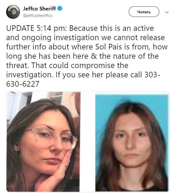 Также сообщается, что к поискам подозреваемой подключилось ФБР. Как стало известно, школам в районе города Денвер угрожала прибывшая в штат вечером 15 апреля 18-летняя белая американка Сол Паис. «Она была вооружена и считается чрезвычайно опасной», — приводит телеканал слова представителя офиса шерифа Майка Таплина.
