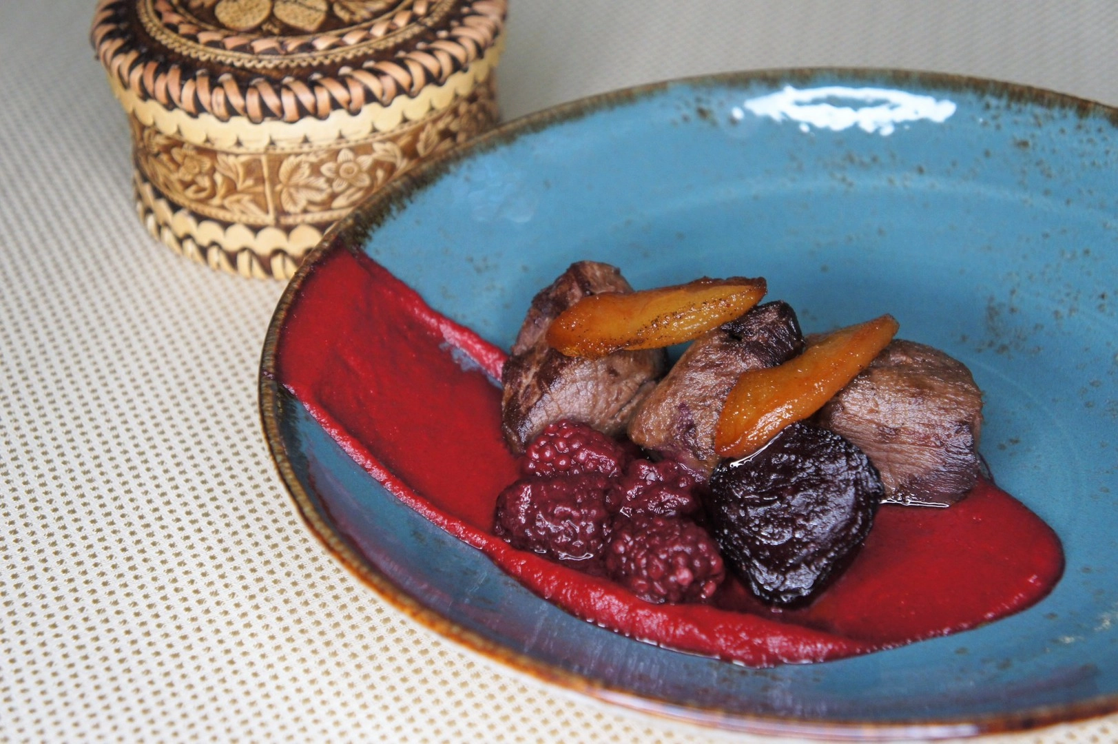 Верхоянская жеребятина из русской печи с морковным пломбиром и взваром из смородинового листа.