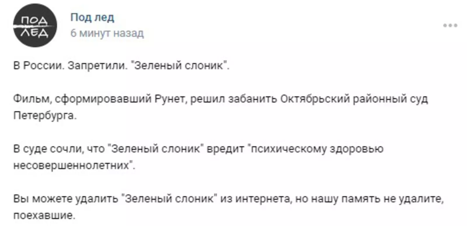 «Фильм, сформировавший Рунет, решил забанить Октябрьский районный суд Петербурга. Вы можете удалить „Зеленый слоник“ из интернета, но нашу память не удалите, поехавшие», — прокомментировала эту новость администрация паблика «Под лед».