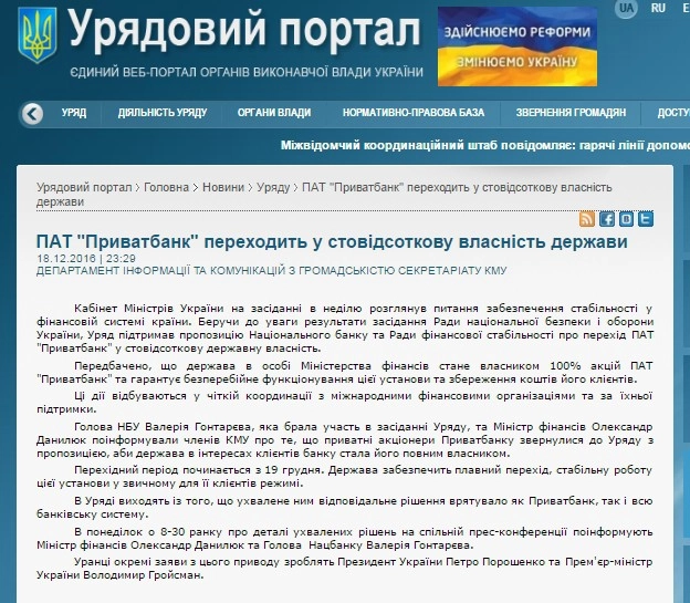 Вечером в воскресенье, 18 декабря, на правительственном портале Украины появилось сообщение о национализации «Приватбанка», 100% акций которого теперь принадлежат государству в лице Министерства финансов.