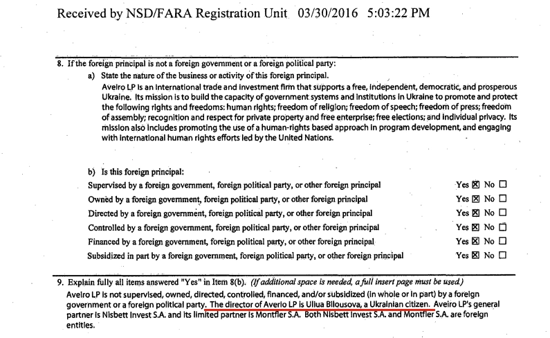 Оплата для Wiley Rein LLP произведена в первом квартале 2016 года для «продвижения интересов в поддержку независимой Украины» в рамках законопроекта S.2692 при его лоббировании в Сенате, Палате Представителей и Службе национальной безопасности США.