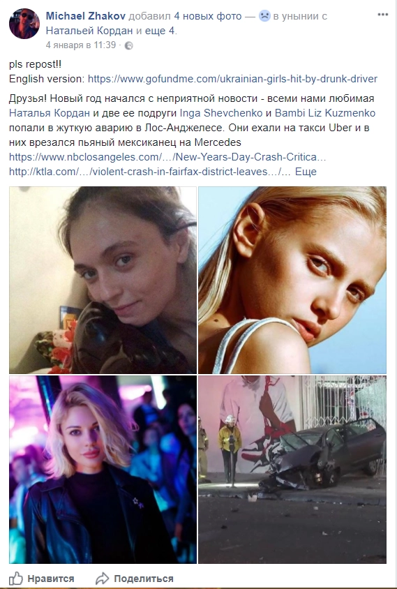 Известная украинская модель Елизавета Кузьменко попала в серьезную аварию в Калифорнии. Вместе с фотографом Натальей Кордан и стилистом Ингой Шевченко они возвращались в такси с новогодней вечеринки. В это время в них врезался Mercedes.