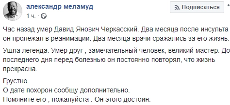 О его кончине сообщил на свой странице в Facebook киевский предприниматель Александр Меламуд.