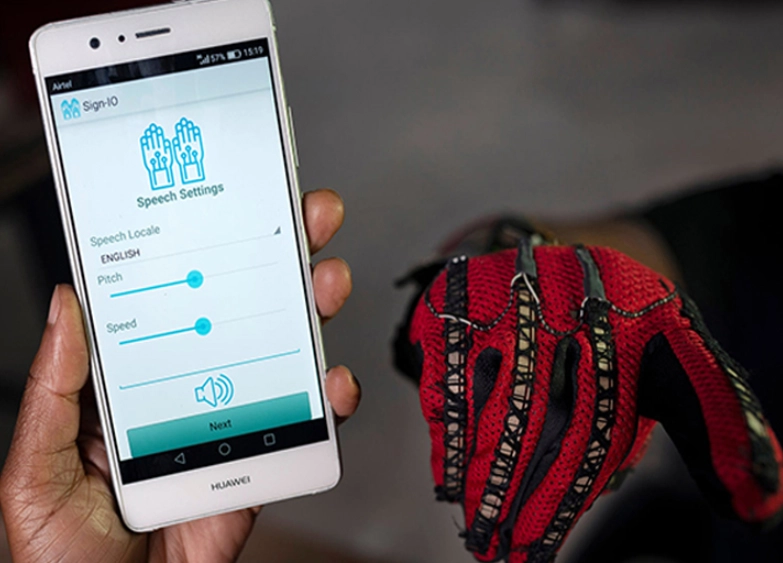 Перчатки Sign-IO оснащены датчиками, установленными на каждом из пяти пальцев, для определения его движений, в том числе степени изгиба пальца. Перчатки подключены через Bluetooth к приложению Android, которое использует функцию преобразования жестов в устную речь.