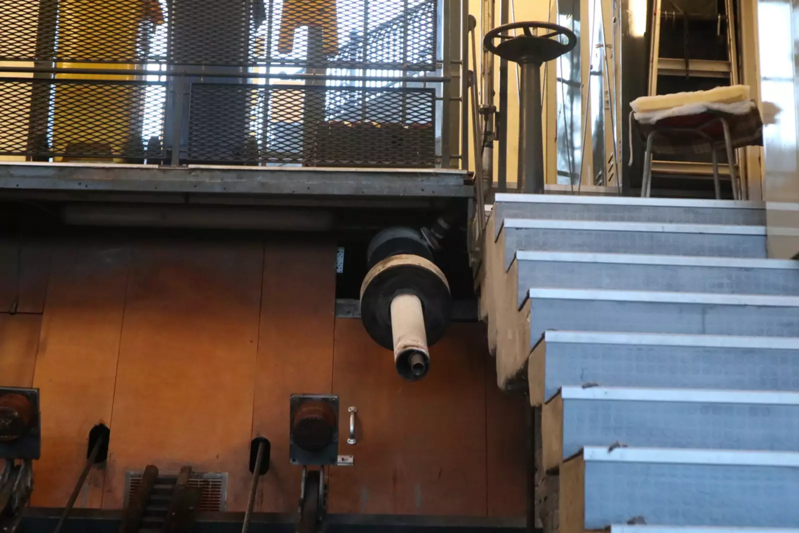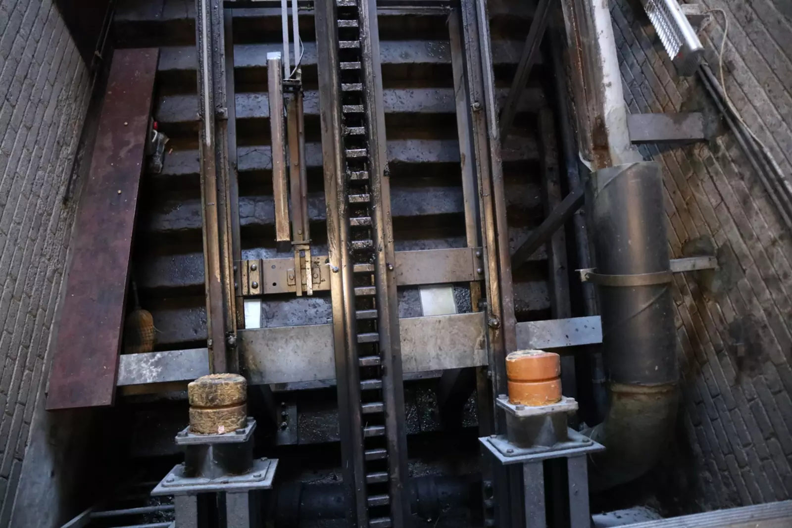 Работает это так: две кабинки, работающие в противовес. У каждой есть большой бак. Когда кабинка подъезжает наверх, этот бак по специальной трубе заполняется нечистотами из сливной трубы.
