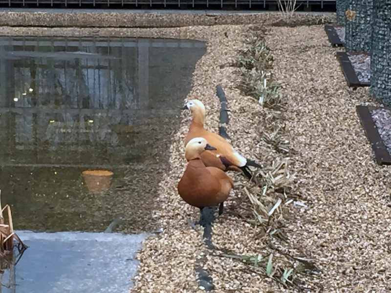 Большой пруд сада ещё покрыт льдом, поэтому огари гуляют и пьют воду из маленького водоёма за "Садом лекарственных трав". Они прилетают максимально рано, чтобы застолбить себе место: если прозевать время, другая пара огарей может выставить свои претензии на водоёмы "Аптекарского огорода". Кстати, на открытой воде уткам проще спасаться от местных кошек.