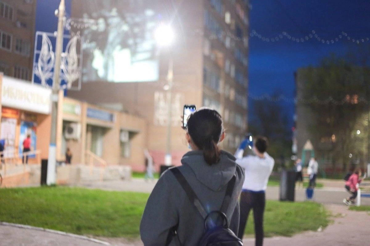 На фото через проектор вывели сюжеты из военных хроник и портреты участников и ветеранов ВОВ. При этом каждый желающий житель смог отправить фотографию своих героев, и они были показана во время трансляции. К данной акции подключились около 8 регионов РФ.