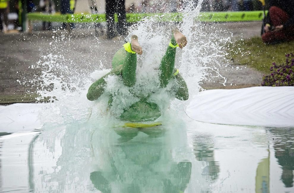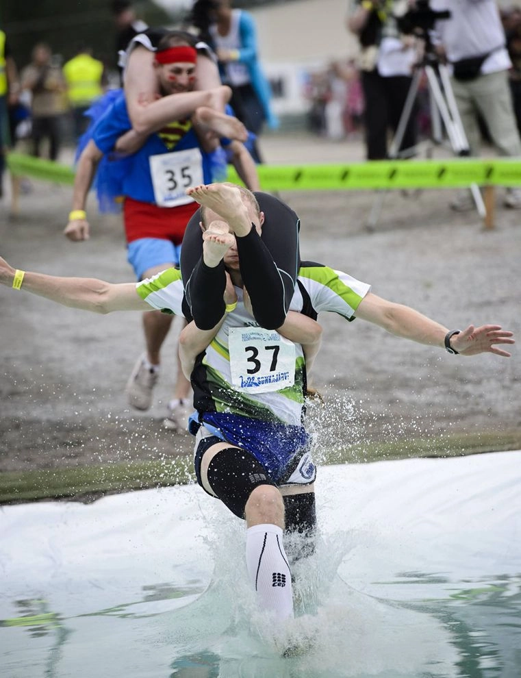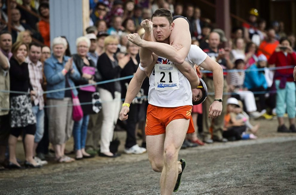 Есть еще командные соревнования с теми же правилами, только три мужчины по очереди несут одну женщину — групповая э-э… эстафета, скажем так. Помимо победителя поощряются также самая веселая пара, пара в лучших костюмах и самый сильный носильщик.