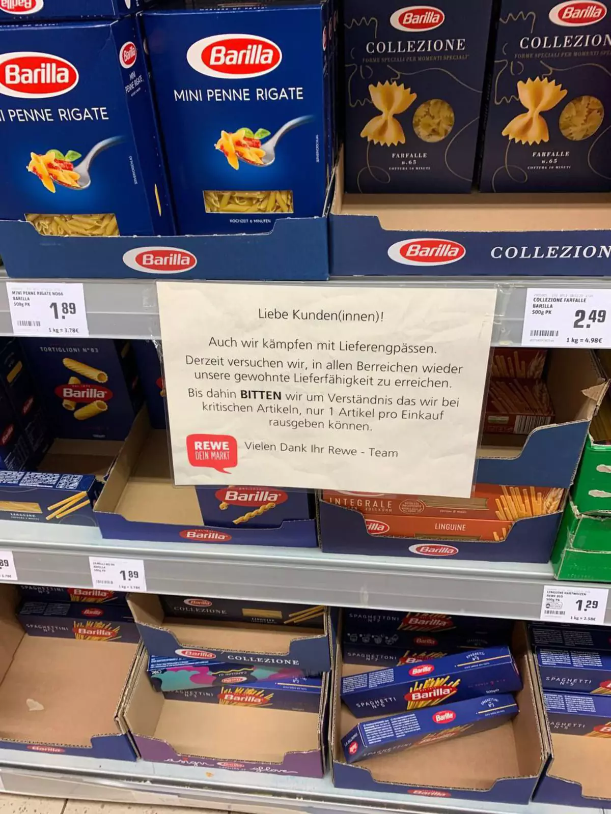 Макароны, мука и другие бакалейные товары продаются сейчас в немецких супермаркетах только по одной пачке на человека.