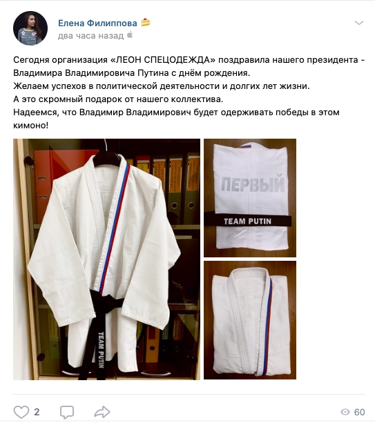 В Иваново на фабрике по пошиву одежды выпустили кимоно в честь дня рождения президента России Владимира Путина. На спортивной одежде вышиты флаг России и надпись «Первый», а на черном поясе — Putin Team.