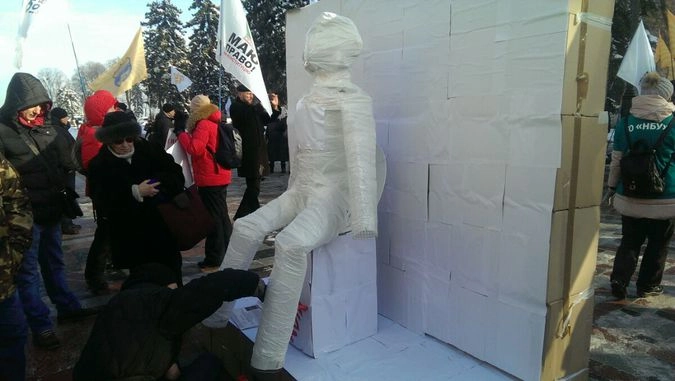 Митингующие в центре Киева устроили своеобразный перфоманс. Как сообщает украинское издание «Вести», демонстранты пронесли в Верховную Раду чучело президента и водрузили его на импровизированный унитаз с надписью «Конституция Украины».
