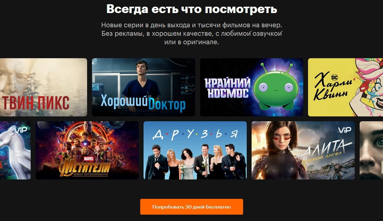 Один из самых доступных онлайн-сервисов для просмотра фильмов. Стоимость подписки всего 269 рублей в месяц, тестировать сервис бесплатно можно 30 дней. В подписку входят: тысячи фильмов и сериалов, в том числе и эксклюзивных, подписка Яндекс. плюс (лишь бы Яндекс.Браузер автоматически не установился), фильмы и сериалы Vip Play. Также есть расширенная подписка, которая включает в себя каталог сериалов онлайн-сервиса Амедиатека, цена вопроса — 649 рублей в месяц.