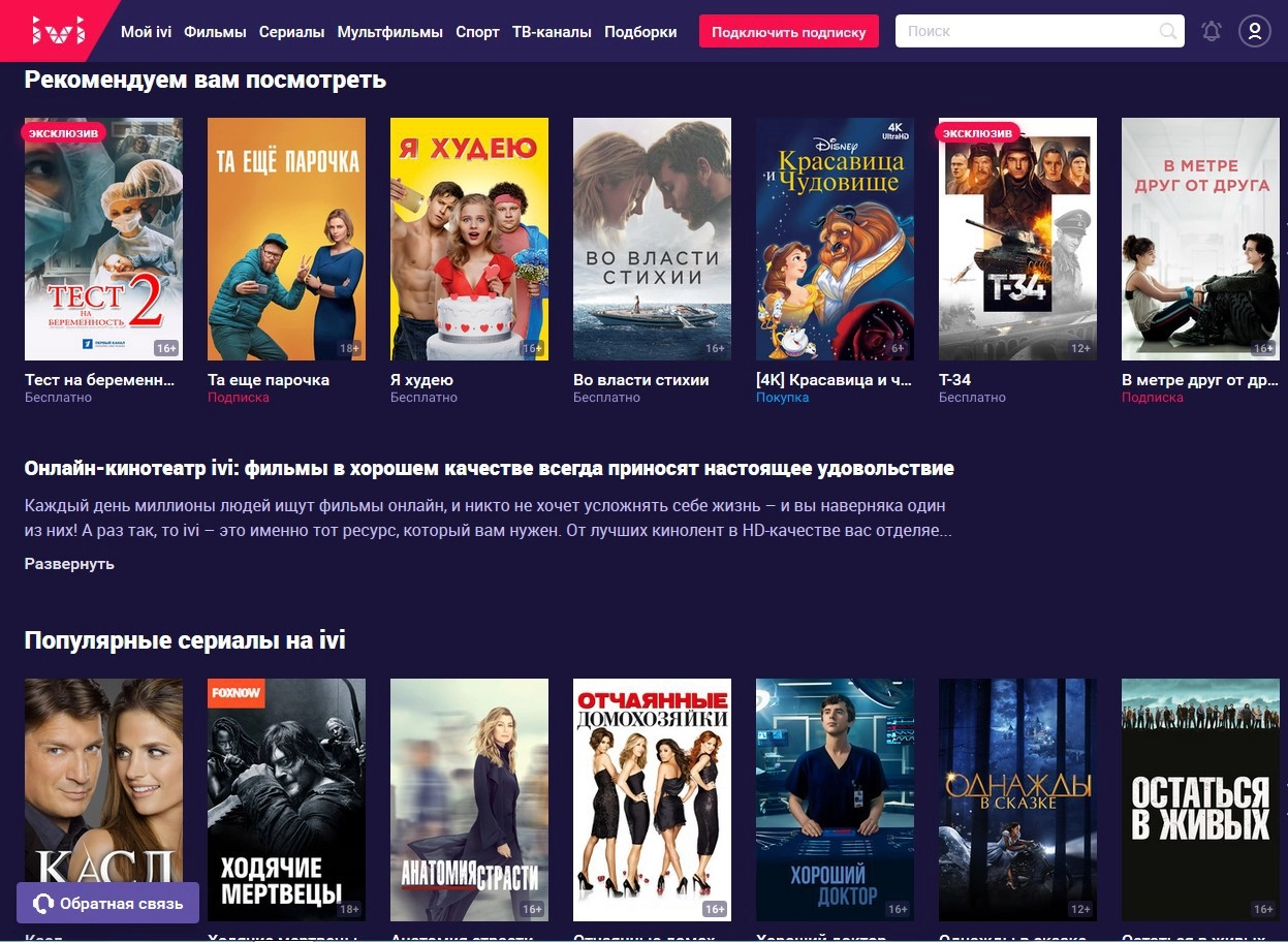 Бесплатных фильмов довольно много, правда, среди них встречаются ленты довольно сомнительного качества (и мы это не про качество изображения, а про сюжет, сценарий, актерскую игру и все, что обычно ценится в хороших фильмах). Кроме того, просмотр будет регулярно прерывать реклама. Один из главных плюсов сервиса — возможность скачать фильмы и сериалы на телефон или компьютер.
