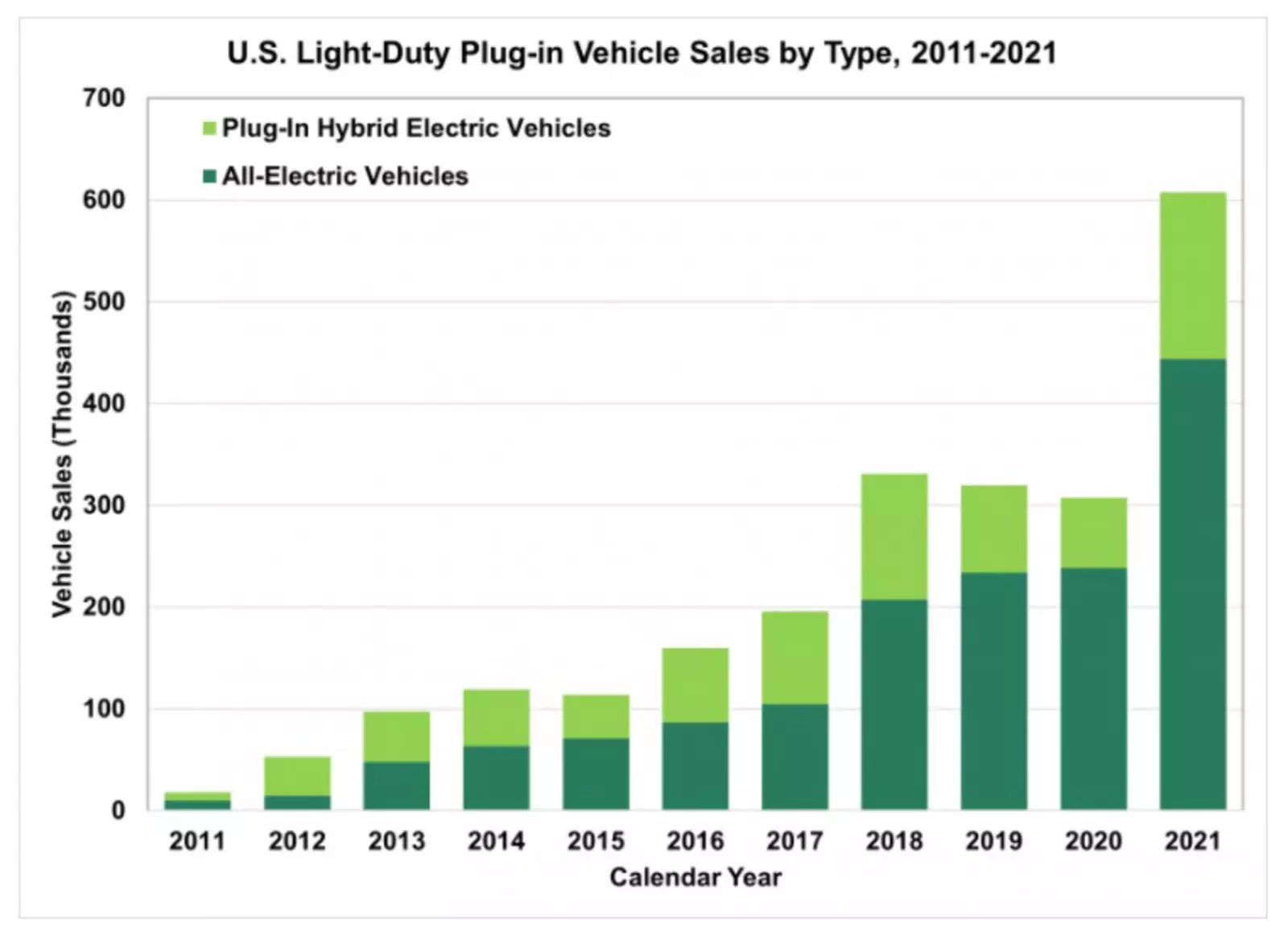По данным Министерства энергетики, продажи новых электромобилей в США в прошлом году достигли 608 000, что почти вдвое больше, чем в 2020 году. Общий объем продаж легковых автомобилей в стране за тот же период увеличился всего на 3%.