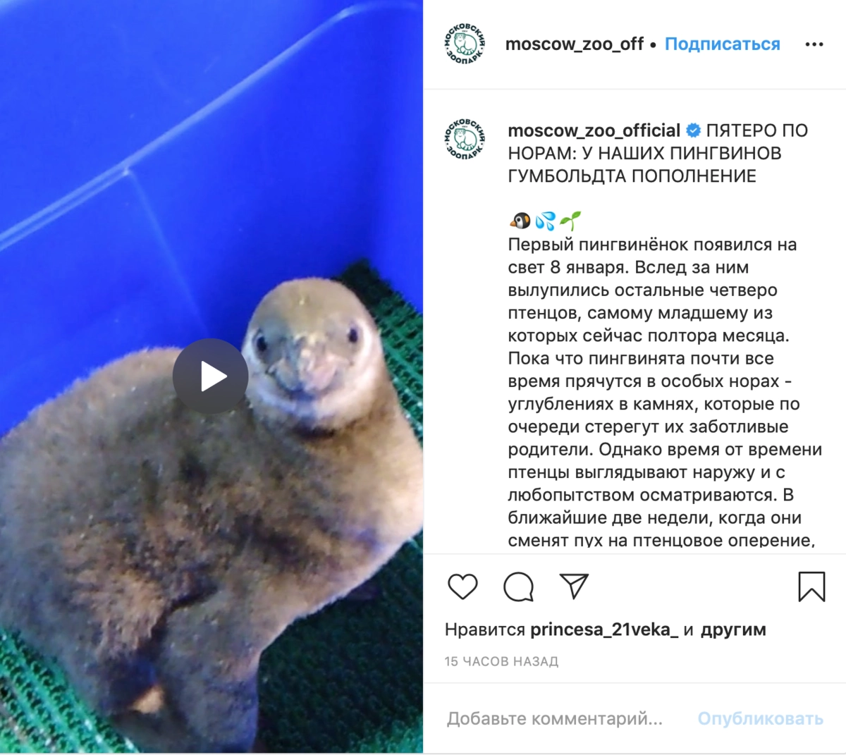 Рожденные в столичном зоопарке пингвины Гумбольдта уже пополнили коллекции зоосадов Ижевска, Новосибирска, Воронежа и острова Тенерифе. В природе этот вид обитает на западном побережье Латинской Америки от Перу до Чили, по данным орнитологов, их популяция насчитывает не более 32 тыс. особей.