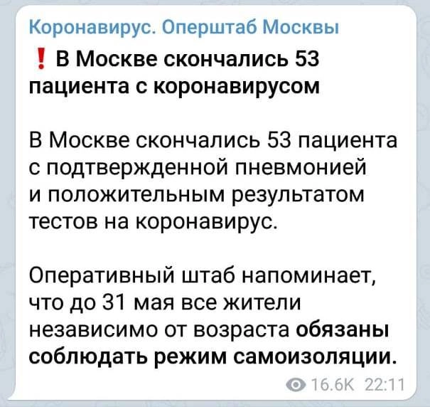 В Москве скончались 53 пациента с подтвержденной пневмонией и положительным результатом тестов на коронавирус, — говорится в сообщении.В оперштабе также напомнили, что до 31 мая все жители города независимо от возраста обязаны соблюдать режим самоизоляции.