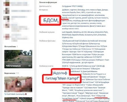Оказалось, молодой человек любит фотографировать оружие, раскладывая его в форме славянских символов, которые сегодня используют неонацистские организации. Ультраправой теме посвящены паблики, на которые подписан Бобров. Кроме того, полицейский состоит в группах, посвященных сатанизму и BDSM, утверждает телеканал. Также в списке его любимых книг указана «Майн кампф» Адольфа Гитлера. А в разделе видео на странице Боброва журналисты нашли ролики с порнографией.
