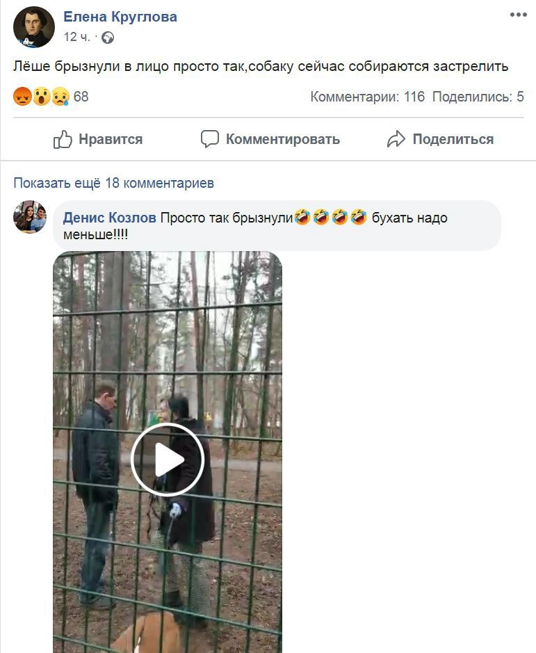 «Мы вышли гулять с собакой, вышел конфликт с другими собачниками, обычный конфликт. Потом приехала полиция, и не успела я глазом моргнуть, как у меня муж лежит весь забрызганный газом. Я полицейскому говорю: „Что вам, Путин сказал, что можно делать все, что угодно?“. Он сказал: „Да“, — вытаскивает пистолет и говорит: „Сейчас я застрелю твою собаку, если рот свой не закроешь“», — цитирует комментарий Кругловой «МБХ медиа».