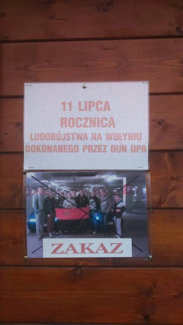 На фото изображены украинские студенты с красно-черным флагом, фото перечеркнуто и на нем присутствует надпись «Запрещено». Используется фото, которое было сделано в 2014 году на стоянке в польском городе Перемышле, позже все украинские студенты за этот поступок были лишены карт поляка и отчислены из учебного заведения.