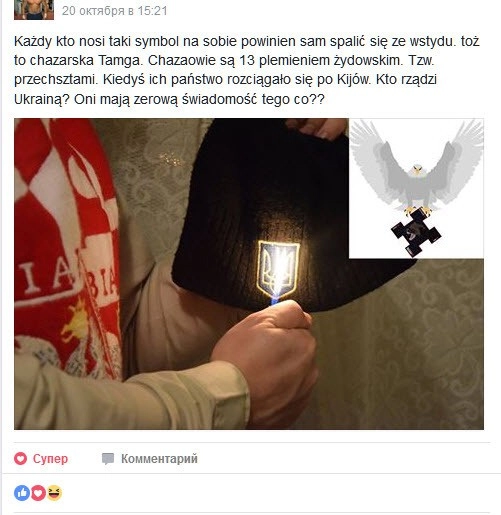 Другой поляк выложил в фейсбук фото, как он подпаливает герб Украины на вязаной шапочке. Причем украинский тризуб он называет «хазарской тамгой».