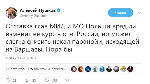 «Отставка глав МИД и МО Польши вряд ли изменит ее курс в отношении России, но может слегка снизить накал паранойи, исходящей из Варшавы», — написал Пушков в своем микроблоге в Twitter.