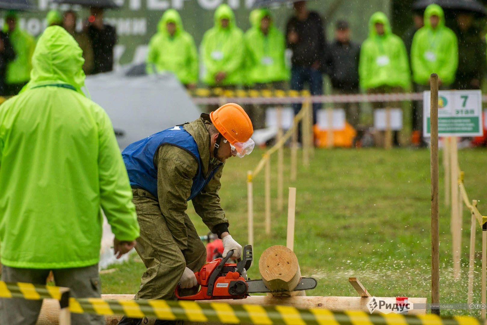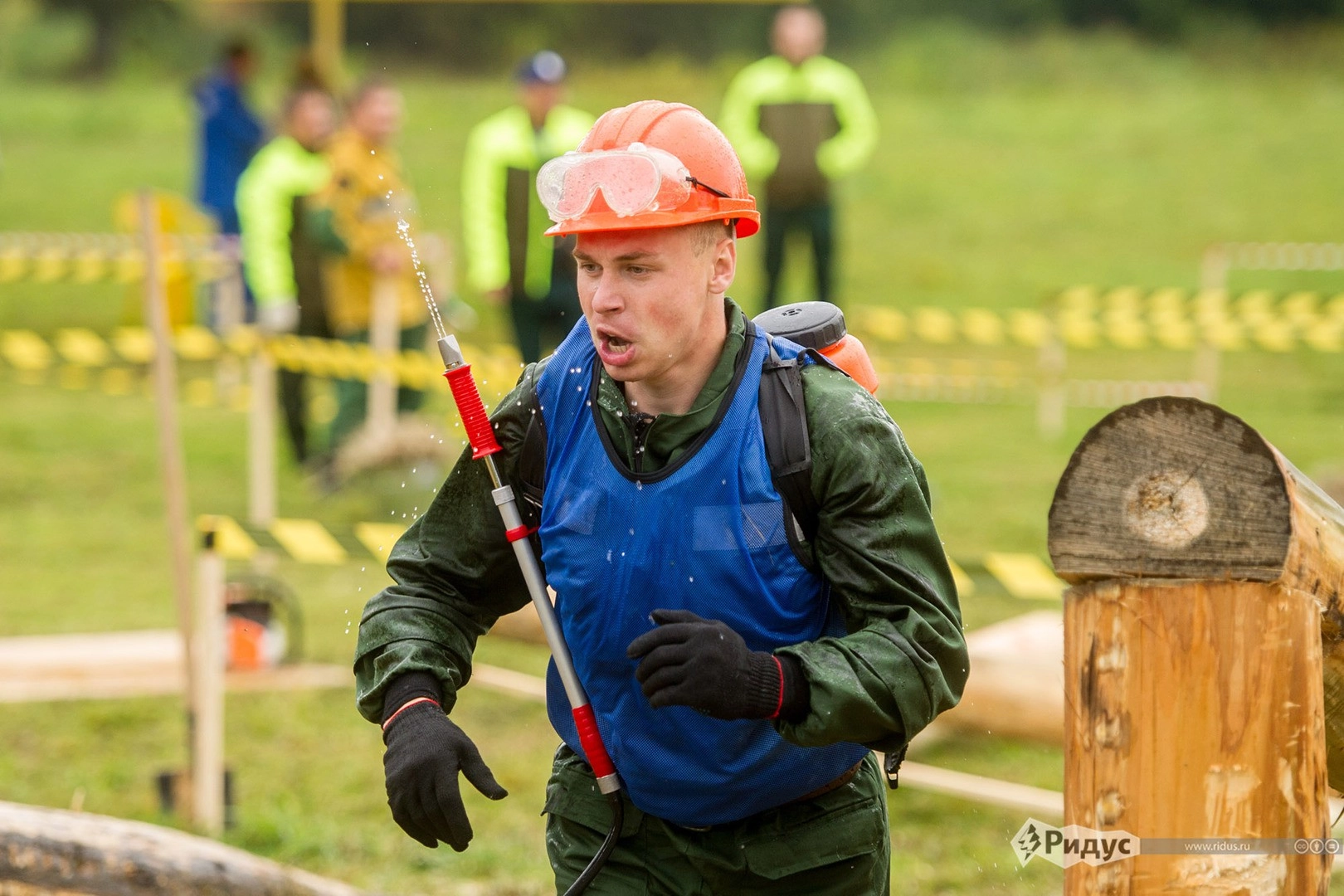 С волнением смогли справиться не все. Напрмер первый этап — заправка ранцевого огнетушителя «Ермак» пятнадцатью литрами воды сложностей не вызвал, а вот перелезть 10 наклонных бревен, да еще и скользких от начавшегося дождя, без сучка и задоринки смогли не все.