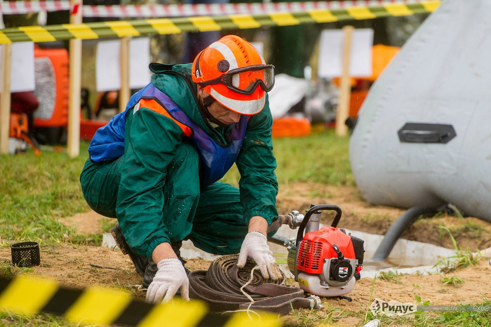 Справившись с бревном конкурсанты хватали мотопомпу с пожарным рукавом и бежали 70 метров с ней к последнему рубежу испытаний - импровизированному водохранилищу, водой из которого с помощью мотопомпы нужно было потушить небольшое огонь условного лесного пожара. Тут главной трудностью было правильно размотать рукав, что бы не допустить образования узлов и перегибов, мешающих подаче воды.
