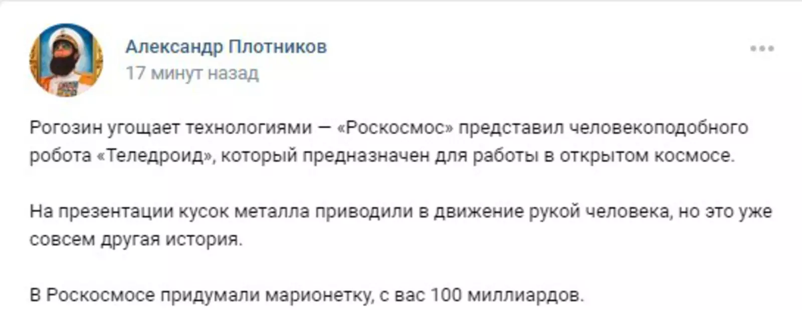 Представитель «Роскосмоса» Дмитрий Белкин отказался комментировать «Ридусу» презентацию нового робота госкорпорации — управляемого по принципу аватара «Теледроида».
