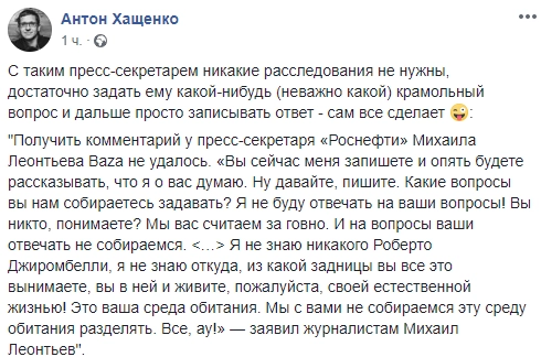Я не знаю никакого Роберто Джиромбелли, я не знаю, откуда, из какой задницы вы всё это вынимаете, вы в ней и живите, пожалуйста, своей естественной жизнью! Это ваша среда обитания. Мы с вами не собираемся эту среду обитания разделять, - цитирует Леонтьева паблик.С таким пресс-секретарем никакие расследования не нужны, отметил политолог Антон Хащенко.