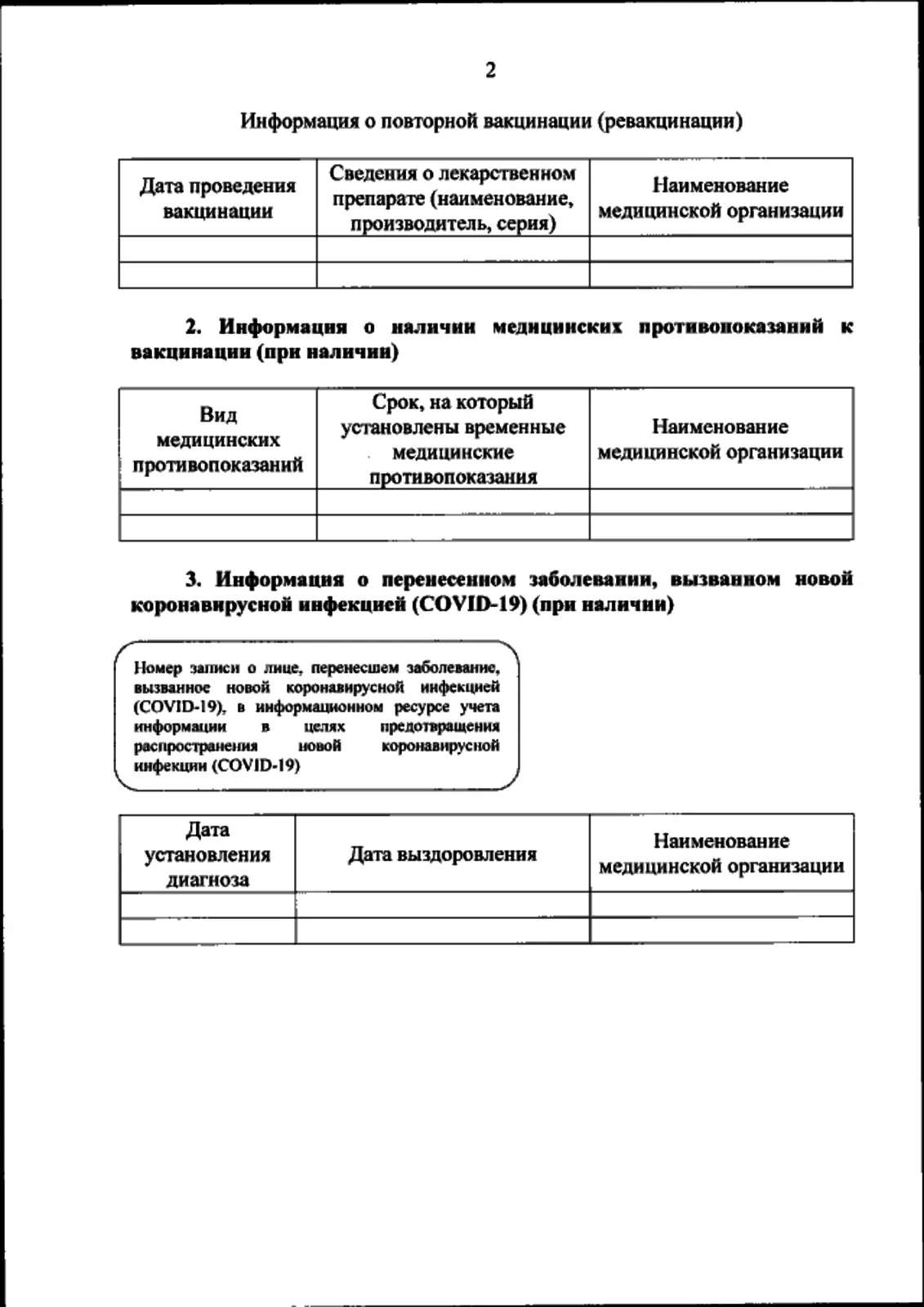«Утвердить форму медицинской документации „Сертификат о профилактических прививках против новой коронавирусной инфекции (COVID-19) или медицинских противопоказаниях к вакцинации и (или) перенесенном заболевании, вызванном новой коронавирусной инфекцией“», — говорится в тексте приказа.