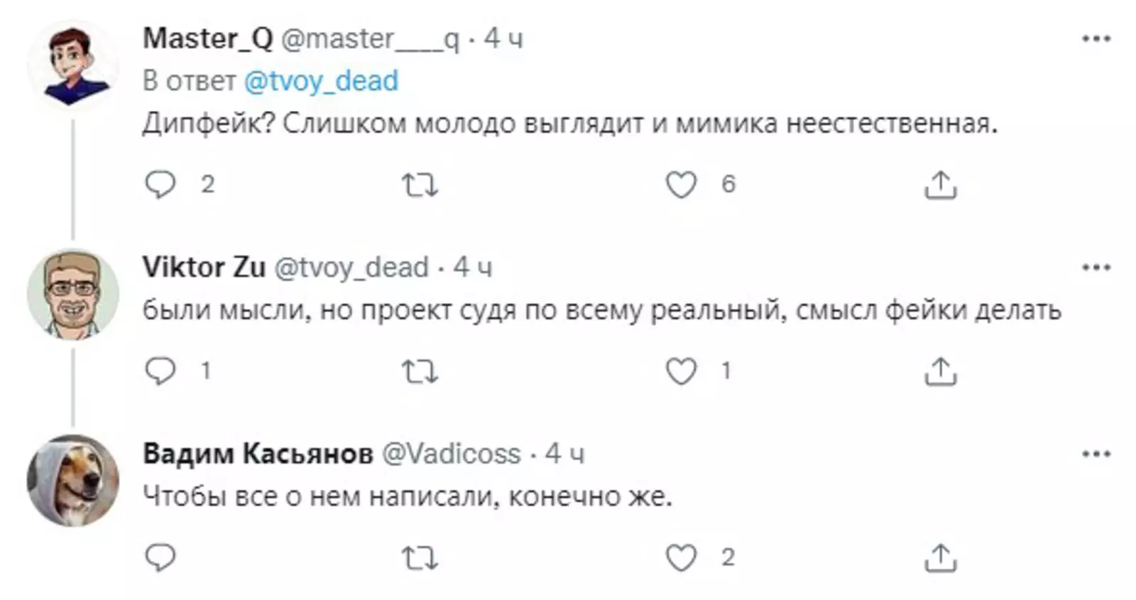 Но многие все-таки сочли ролик созданным нейросетью дипфейком, который запустили Мусагалиев и его команда в целях рекламы нового проекта. Появилась даже теория, что мимику компьютерному «Брюсу Уиллису» рисовали как раз с Азамата.