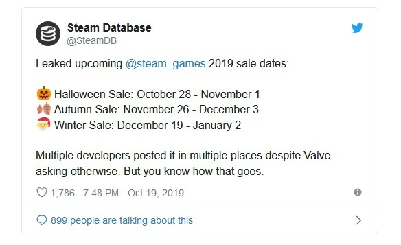 Согласно утечке, самая первая распродажа на Хэллоуин начнется на следующей неделе и продлится с 28 октября до 1 ноября. За этим последует осенняя распродажа с 26 ноября по 3 декабря, а затем, наконец, зимняя распродажа с 19 декабря по 2 января.