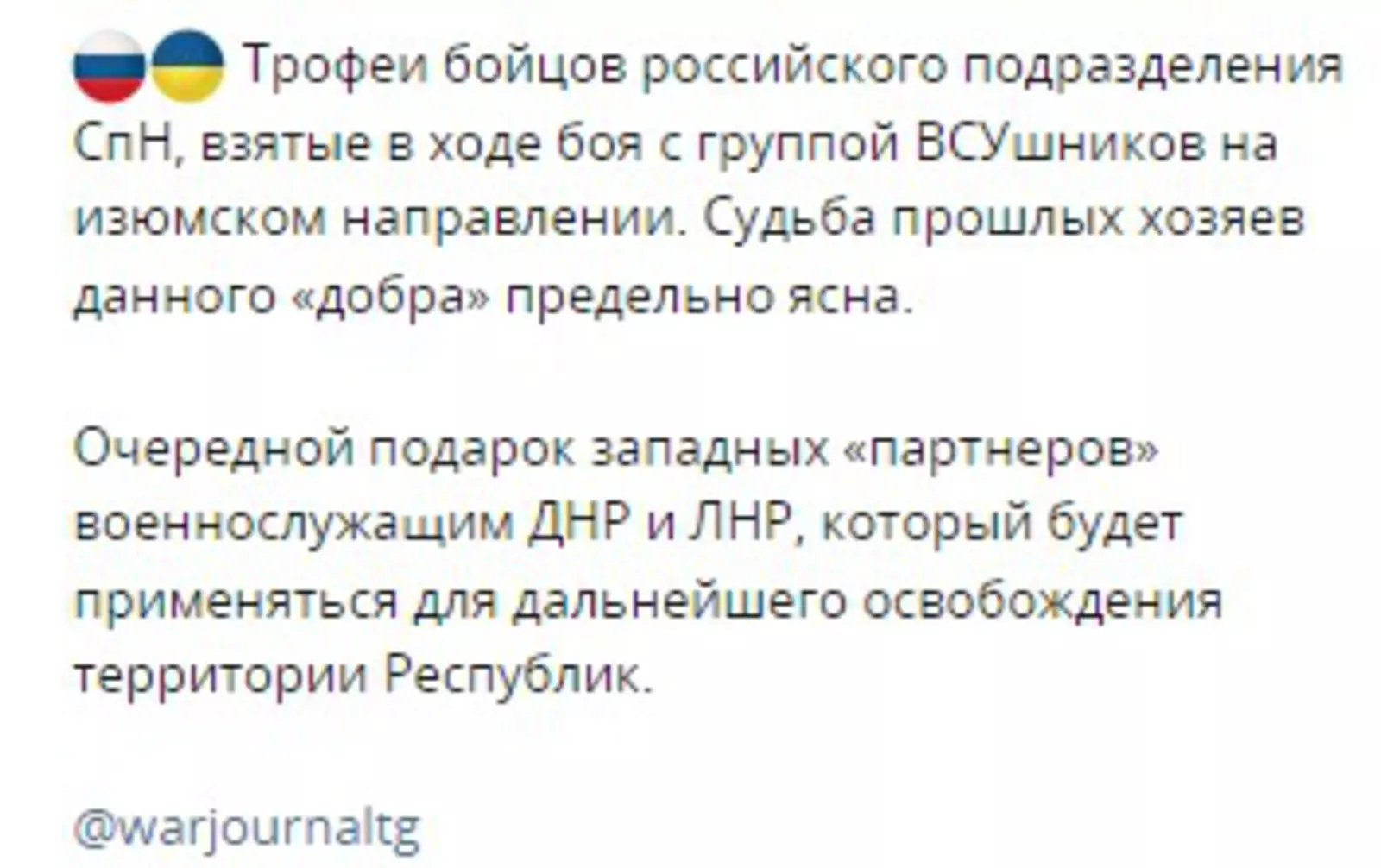 «Очередная партия трофеев из Изюма, которая вскоре поступит на вооружение ЛДНР. Среди них: британский ПТРК NLAW, немецкий РПГ Panzerfaust 3, шведский одноразовый гранатомет″ — гласило объявление.
