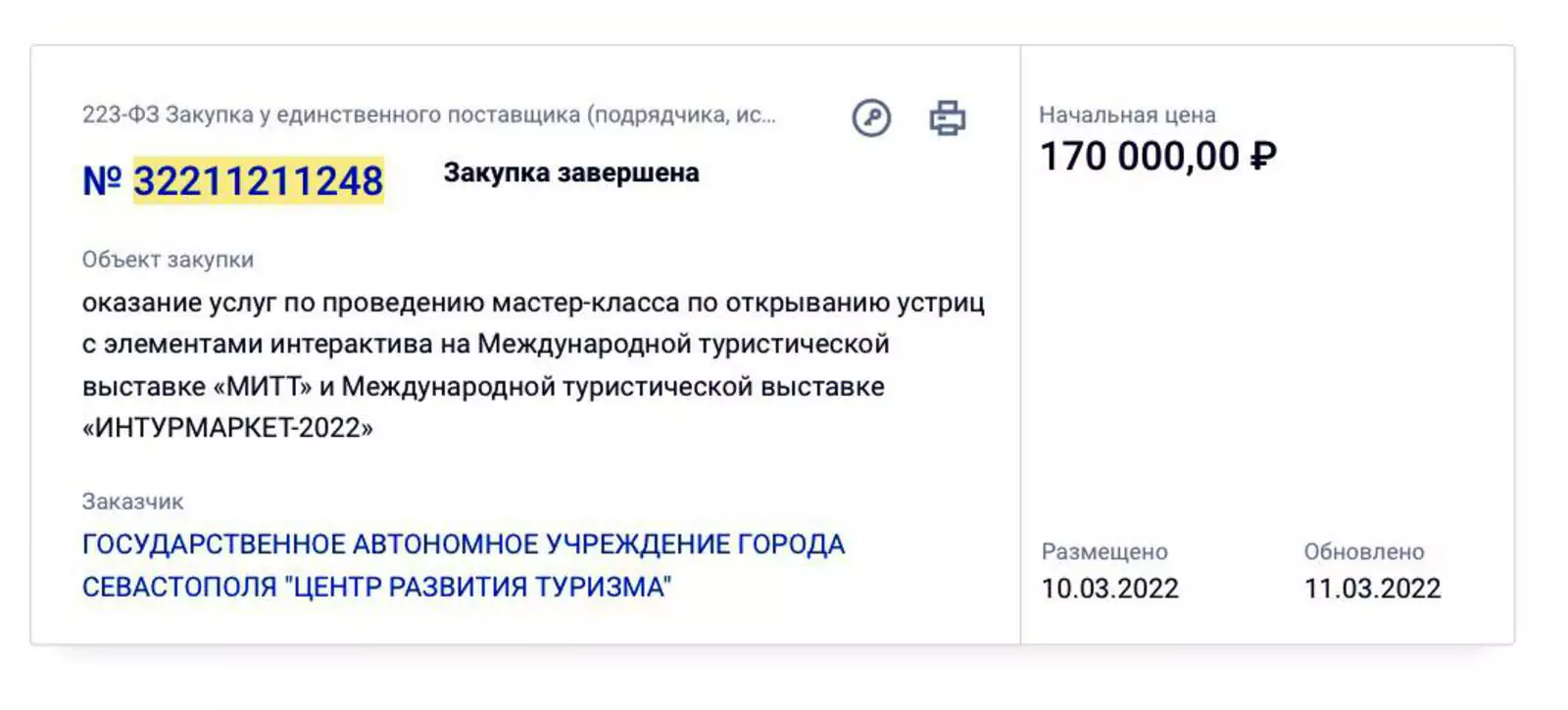 Ранее на сайте госзакупок появилось сообщение о том, что государственное автономное учреждение города Севастополя «Центр развития туризма» заказало услугу «по проведению мастер-класса по открыванию устриц с элементами интерактива на Международной туристической выставке „МИТТ“ и Международной туристической выставке „ИНТУРМАРКЕТ-2022“». Начальной ценой закупки была заявлена сумма в 170 тысяч рублей.