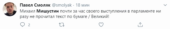 Пользователи Рунета, следившие за онлайн-трансляцией выступления премьера, быстро отметили необычную для политического и государственного деятеля деталь: Мишустин в течение долгого времени — около часа — докладывал парламентариям о целях и планах правительства, не заглядывая в бумажку.