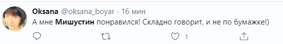 Многих комментаторов в социальных сетях подкупила такая манера публичных выступлений премьер-министра — «прямо в стиле американских политиков». За отсутствие бумажки Михаил Мишустин удостоился похвал от российских пользователей Сети.