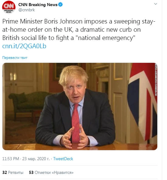 Жителей Великобритании ожидает всеобщий карантин. Он продлится не менее трех недель. Разрешается выходить на улицу лишь в ряде случаев, иначе национальную систему здравоохранения ждет коллапс, заявил премьер-министр страны Борис Джонсон в обращении к нации.