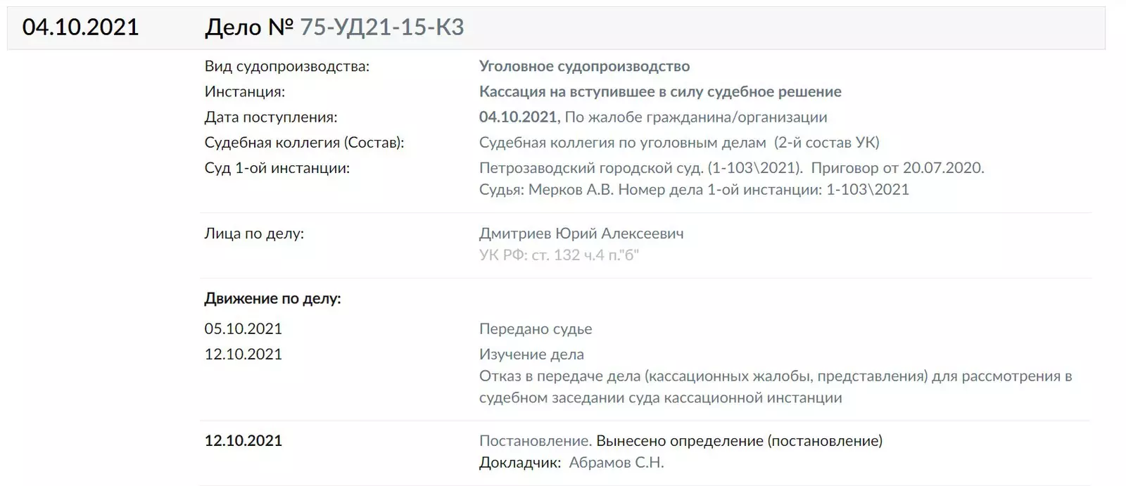 «То есть судья Абрамов почитал дело, по которому карельского историка дважды фактически оправдывали, а потом эти приговоры отменяли, и решил ничего не пересматривать. То есть не допустил дело до кассации, чтобы не имитировать правосудие. Потому что и на кассации результат был таким же. И это очередное дно правосудия», — отметила Светова.