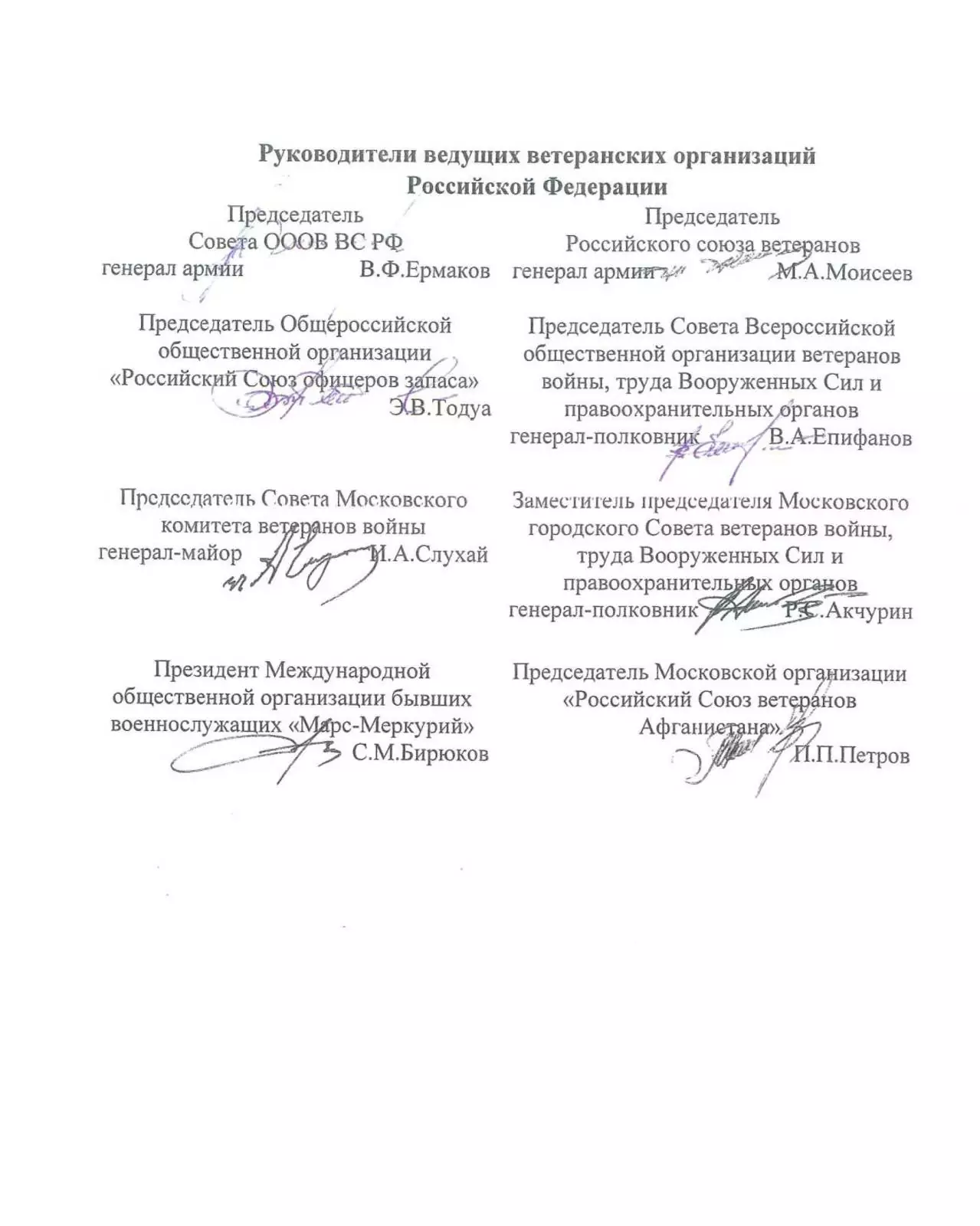 Его подписали председатель Совета ОООВ ВС РФ генерал армии В. Ф. Ермаков, председатель Российского союза ветеранов генерал армии М. А. Моисеев и руководители еще шести ветеранских организаций.