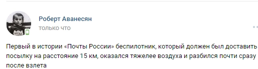 «Первый в истории „Почты России“ беспилотник оказался тяжелее воздуха», — отметил один из них.