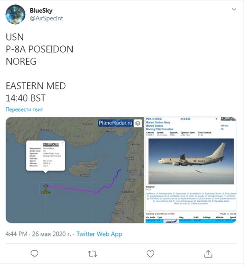 Воздушный разведчик P-8A Poseidon, согласно данным авиасервисов, выполнял полет вблизи побережья Сирии. Русские Су-35 «гоняли» его примерно 64 минуты.