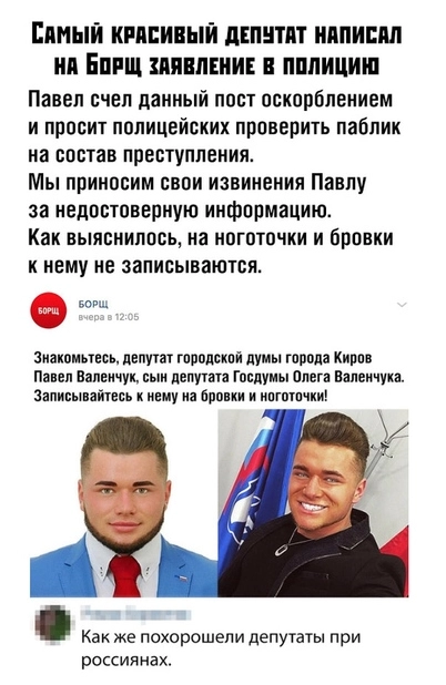 Ранее «Ридус» писал о том, что Павел Валенчук написал заявление в полицию на паблик в соцсети «Вконтакте», который назвал его «самым красивым депутатом» и подшутил над его внешностью. Паблик «Борщ» выложил мем с фотографиями Валенчука. В подписи к коллажу было сказано: «Знакомьтесь, депутат городской думы города Киров Павел Валенчук, сын депутата Госдумы Олега Валенчука. Записывайтесь к нему на бровки и ноготочки».Позднее паблик сообщил, что Валенчук написал на администрацию сообщества заявлению в полицию. Он счел шутку оскорбительной.