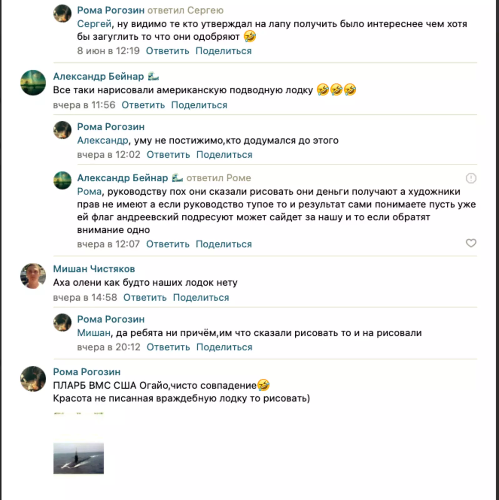Работа художника и властей встретила резкую критику пользователей сети, многие из которых не стесняясь в выражениях заявляют, что мурал это «рисунок-плевок в лицо наших подводников».