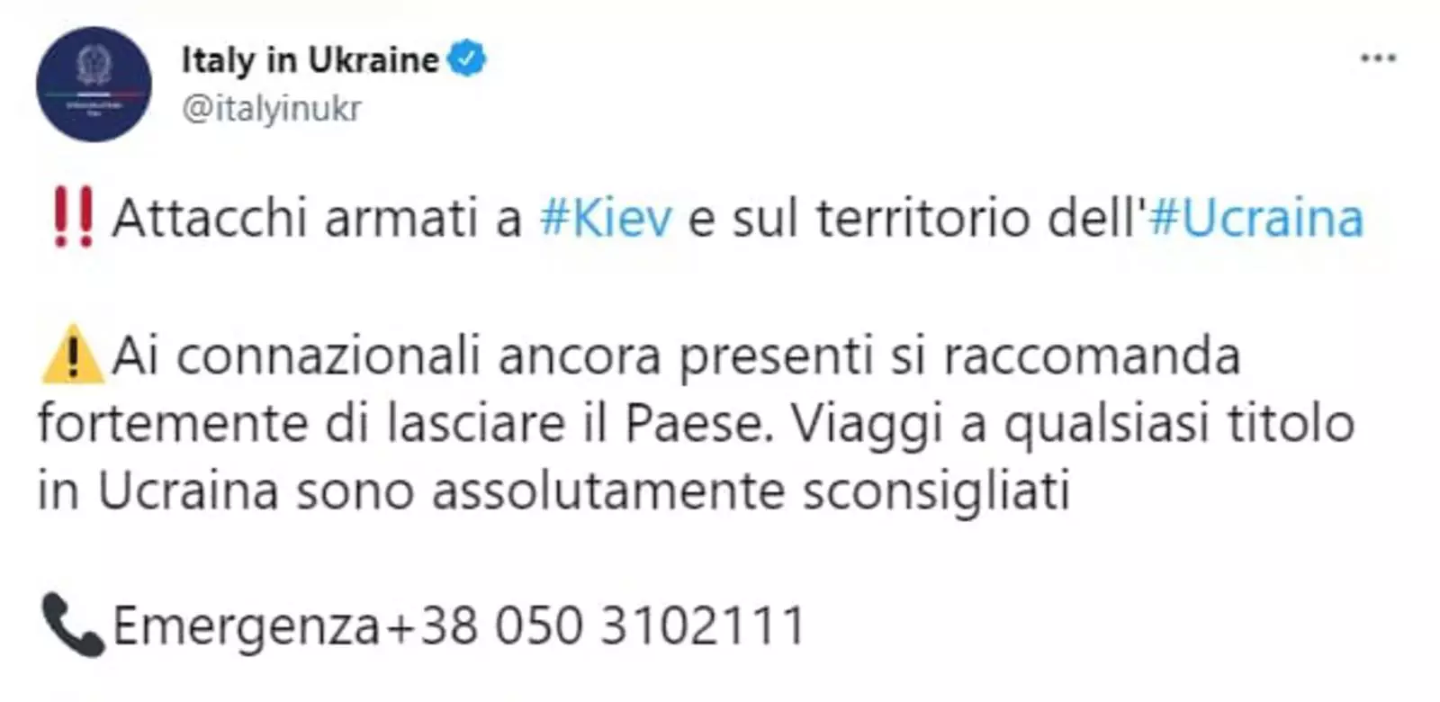 Официальный Рим настоятельно рекомендует гражданам Италии немедленно покинуть Украину и не возвращаться туда, пока ситуация в стране не стабилизируется. Соответствующее обращение было опубликовано на странице итальянского посольства в Киеве.