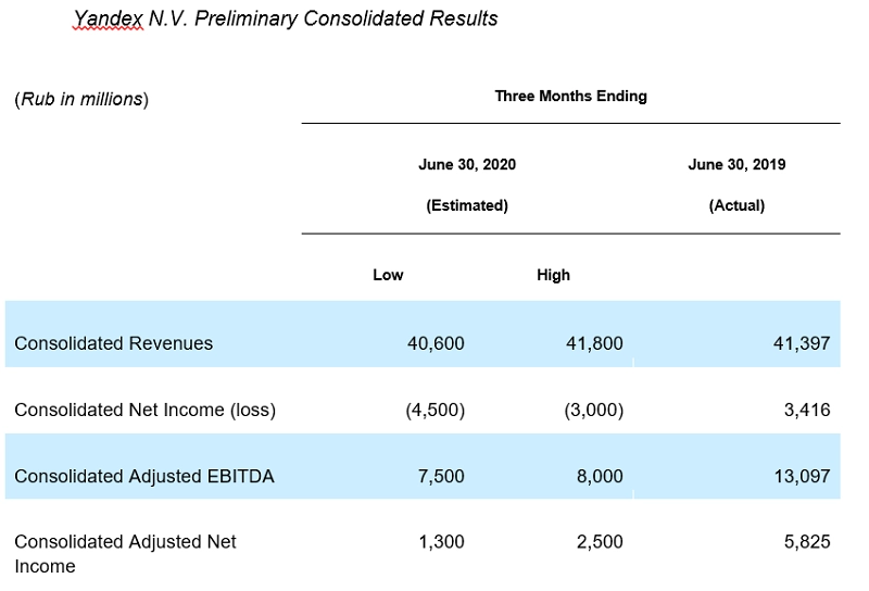 «Яндекс» допускает возможность получения во втором квартале чистого убытка в размере 3—4,5 миллиарда рублей. Причиной этого стало снижение прибыли и скачки валютного курса. Сама выручка может остаться на уровне аналогичного периода прошлого года или же снизиться на 2% до 40,6 миллиарда рублей. Компания считает, что на выручку повлияла пандемия коронавируса, из-за которой упали доходы такси, каршеринга и рекламного бизнеса, но увеличилась прибыль подразделения доставки еды и медиасервисов. Выручка «Поиска» может снизиться на 10% до 25—26 миллиардов рублей. А у «Яндекс.Такси», который объединяет сервис такси и доставку еды, она может увеличиться на 37,3% — до 11,9—12,3 миллиарда рублей.