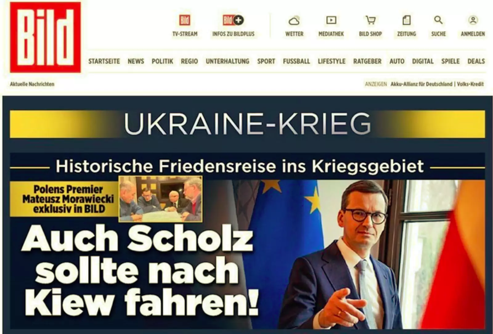 «Я призываю канцлера Шольца, премьер-министра Джонсона, президента США Байдена, президента Франции Макрона и всех глав правительств ЕС также отправиться в Киев, — сказал премьер-министр Матеуш Моравецкий в интервью Bild после возвращения из Киева.