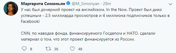 На Facebook миллионы аккаунтов и проектов, для которых не указаны источники финансирования. Собственно, если бы от нас это потребовали, мы бы раскрыли источники — мы никогда их не скрывали,— отметила Симоньян.По ее словам, аффилированность RT и In the Now была очевидной и ни от кого не скрывалась. В качестве аргумента она указала на то, что в роли ведущей роликов, публикуемых на In the Now, выступала штатная журналистка RT Анисса Науэй.