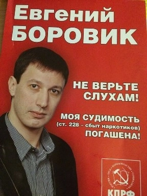 Еще один пример черного пиара в электоральной кампании-2016 — фейковая листовка коммуниста Евгения Боровика: текст на агитке гласит, что кандидат от КПРФ по 170-му березовскому одномандатному округу в Свердловской области наконец-то может похвастать «погашенной судимостью»: