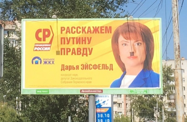 Не только конкурирующие штабы могут испортить репутацию кандидатов, но и погодные условия: пользователи «Пикабу» ведут специфический сериал, посвященный причудливой игре света и тени на агитационных баннерах. Одна из его героев — кандидат по 61-му кудымкарскому одномандатному округу Пермского края от «Справедливой России» Дарья Эйсфельд: